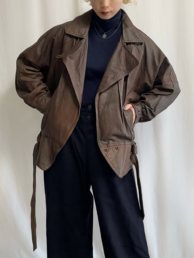 SIZE 肩幅:55cm 身幅:61cm 着丈:84cm 袖丈:65cm 着用者:165cm MATERIALS 素材:レザー Condition 記載するような汚れ・ダメージはございません . . . . . . . . . . ・used,vintage商品である事をご理解いただいた上でご注文ください。 ・ダメージ等がある商品は写真、conditionに記載しておりますが、目立たないダメージは記載していない場合もございます。 ・全ての商品が1点ものとなる為、ご注文後のキャンセル、返品、交換はできませんのでご了承ください ・コンビニ決済の場合、ご注文後2日以内にお支払いをお願いいたします。 ・サイズは平置きで計測しております。多少の誤差が生じる場合もございます。 ・ご使用のデバイスによっては商品の色味が実際の物とは多少異なる場合もございます。
